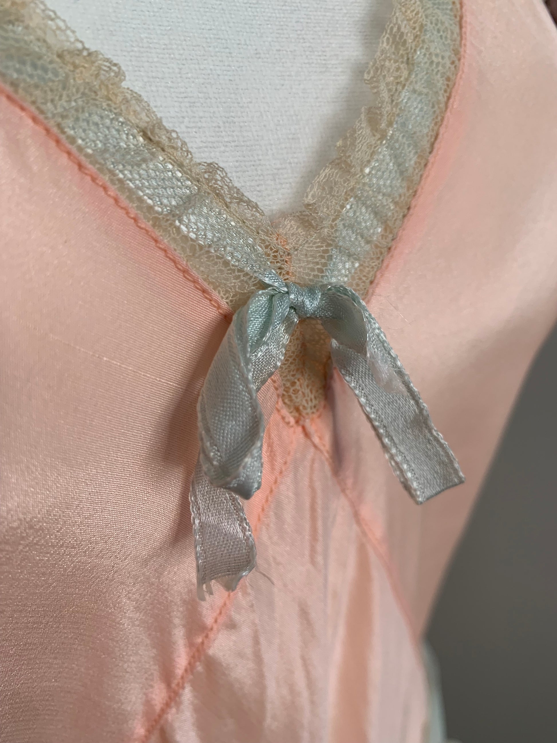 π She is my oldest garment currently in the shop! This 1920s, peach, silk, dream is available now! Trimmed in delicate, beige lace & blue ribbon with bows at the shoulders & bust. Comes with a matching blue ribbon waist tie. No tags. She is very nearly perfect apart from a few pinpoint holes that are nearly impossible to find. Fits a modern size medium. $175 shipped π
