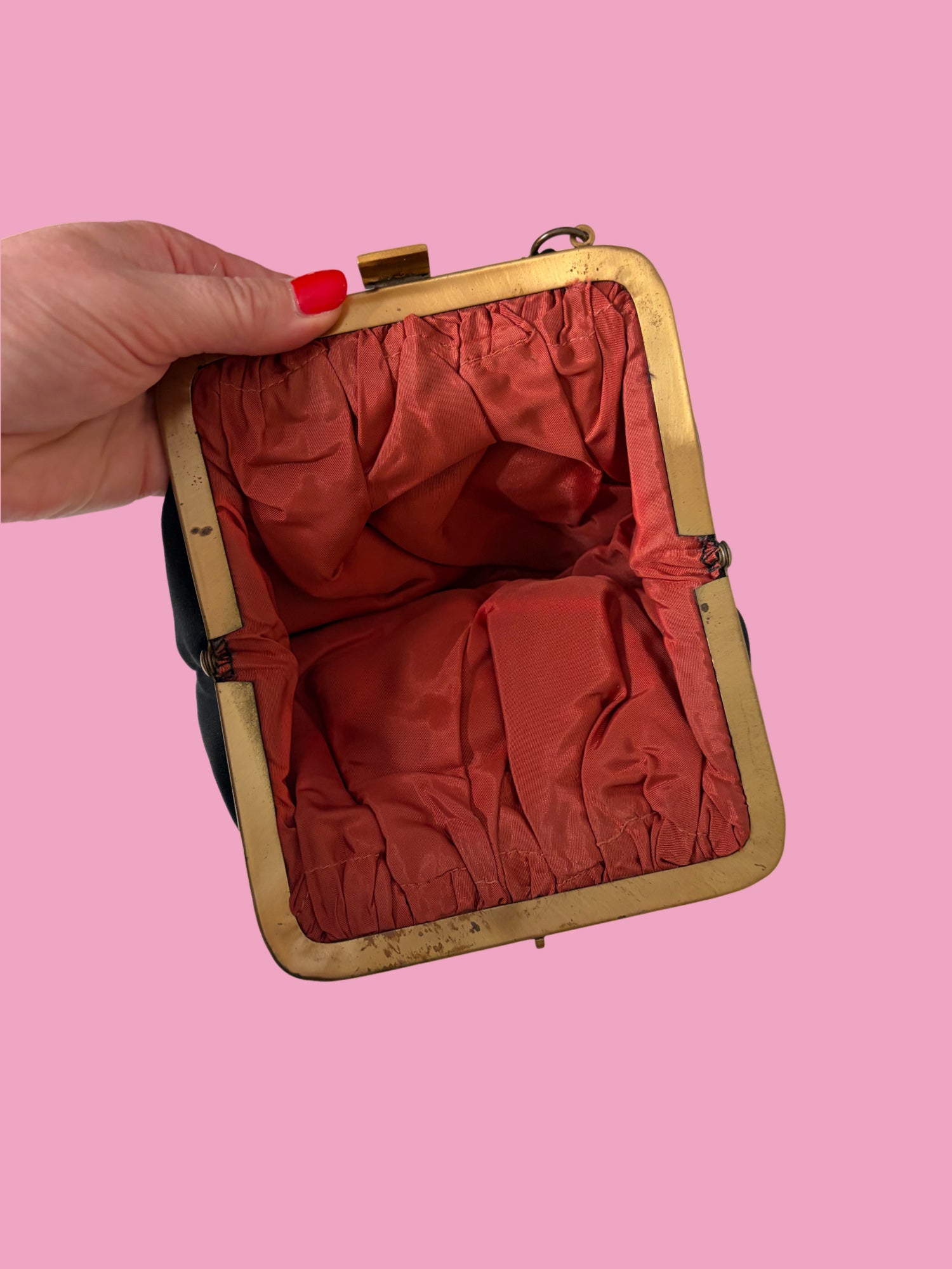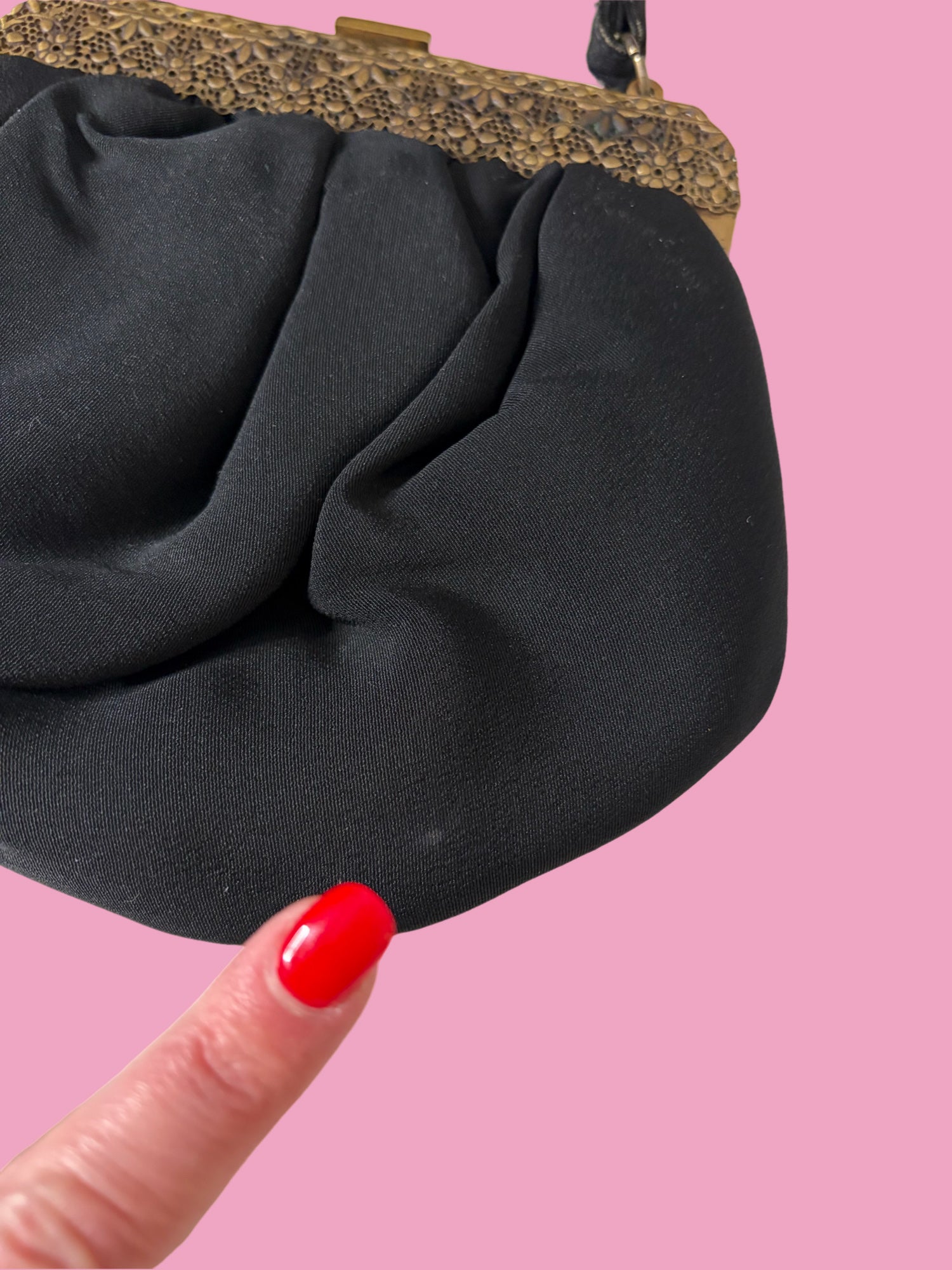 Available now! 1940s, dainty, silk evening bag with ornate, brass filigree frame. Outside of bag is black silk & inside is lined in a lovely rose colored silk. Measures 7” wide, 7” high (12” including strap). Excellent vintage condition! There is a very faint mark on side of bag & a tiny bit of patina on brass. The brass frame on inside of the bag has some scratching. All pictured. $59 shipped.