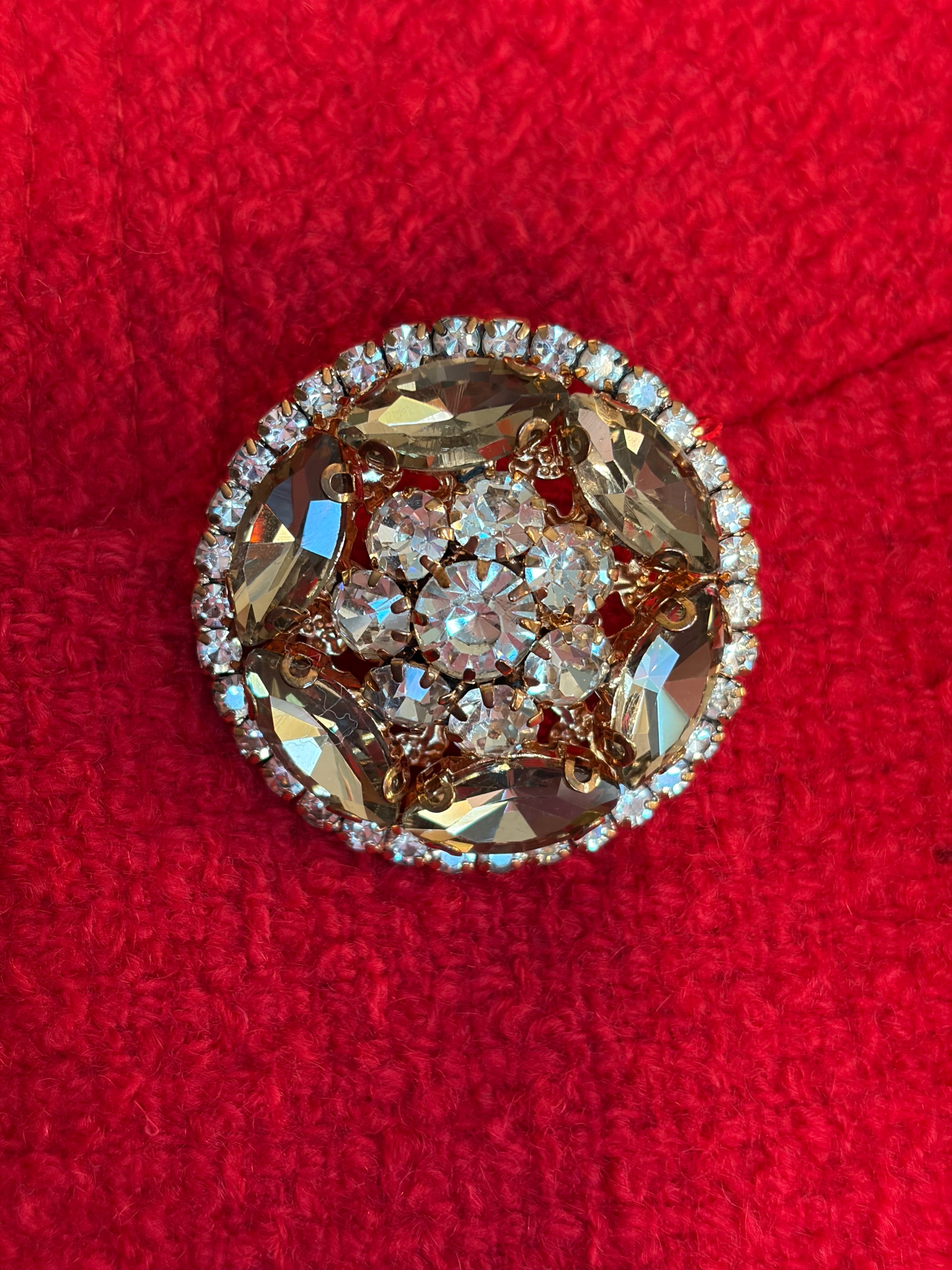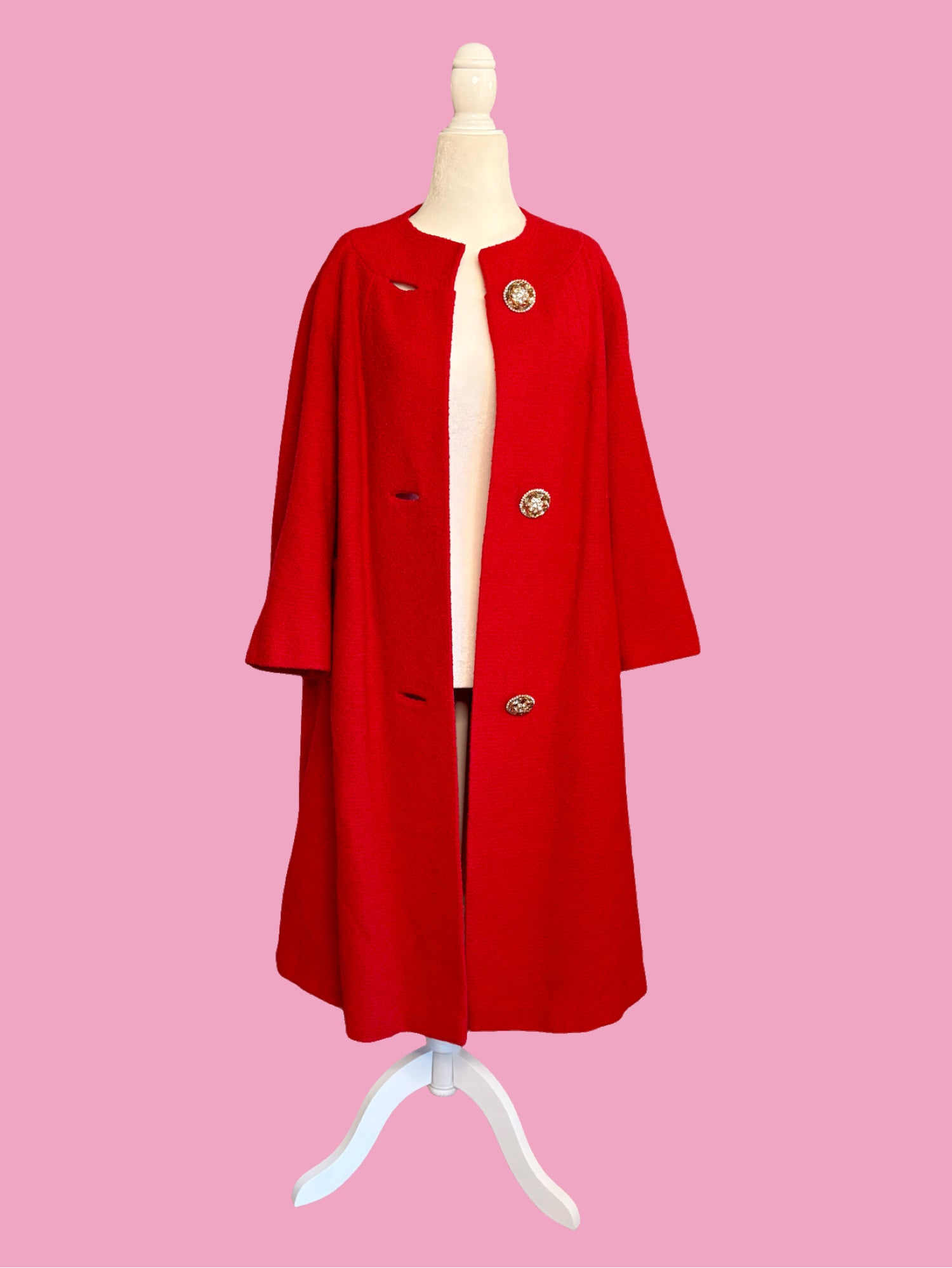 The perfect holiday piece is available now! I have a 1950s, festive, bright red, wool swing coat. Coat is fully lined in red acetate. Sparkly, rhinestone button closure. Side pockets. Fits a size medium. $178 shipped.