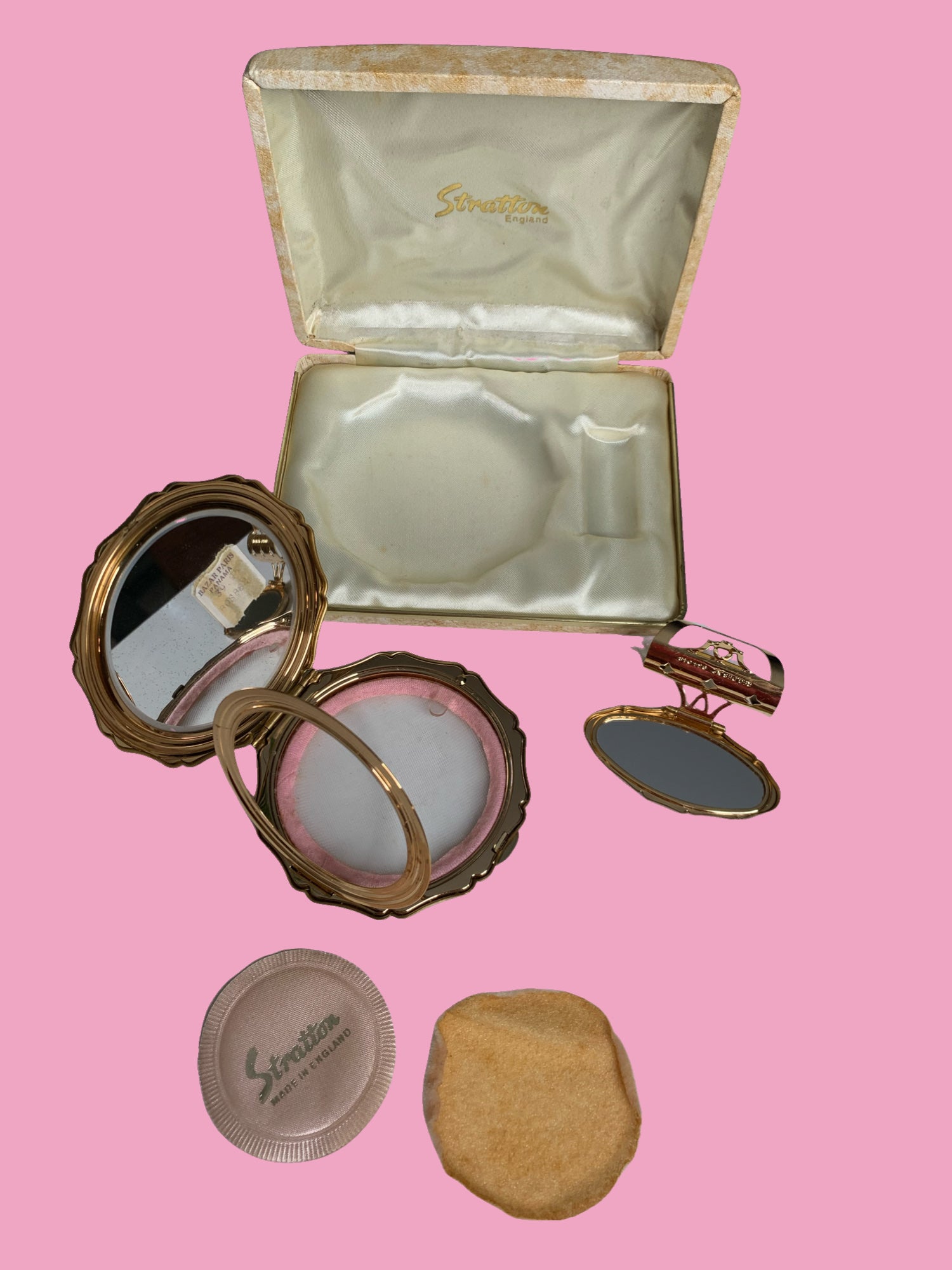 Available now! 1950s Stratton England compact & lipstick holder set. Comes in original box. Neither piece appears to have ever been used. The powder puff has separated/disintegrated with age but not noticeable upon opening. Aside from puff, in mint condition! $158 shipped.