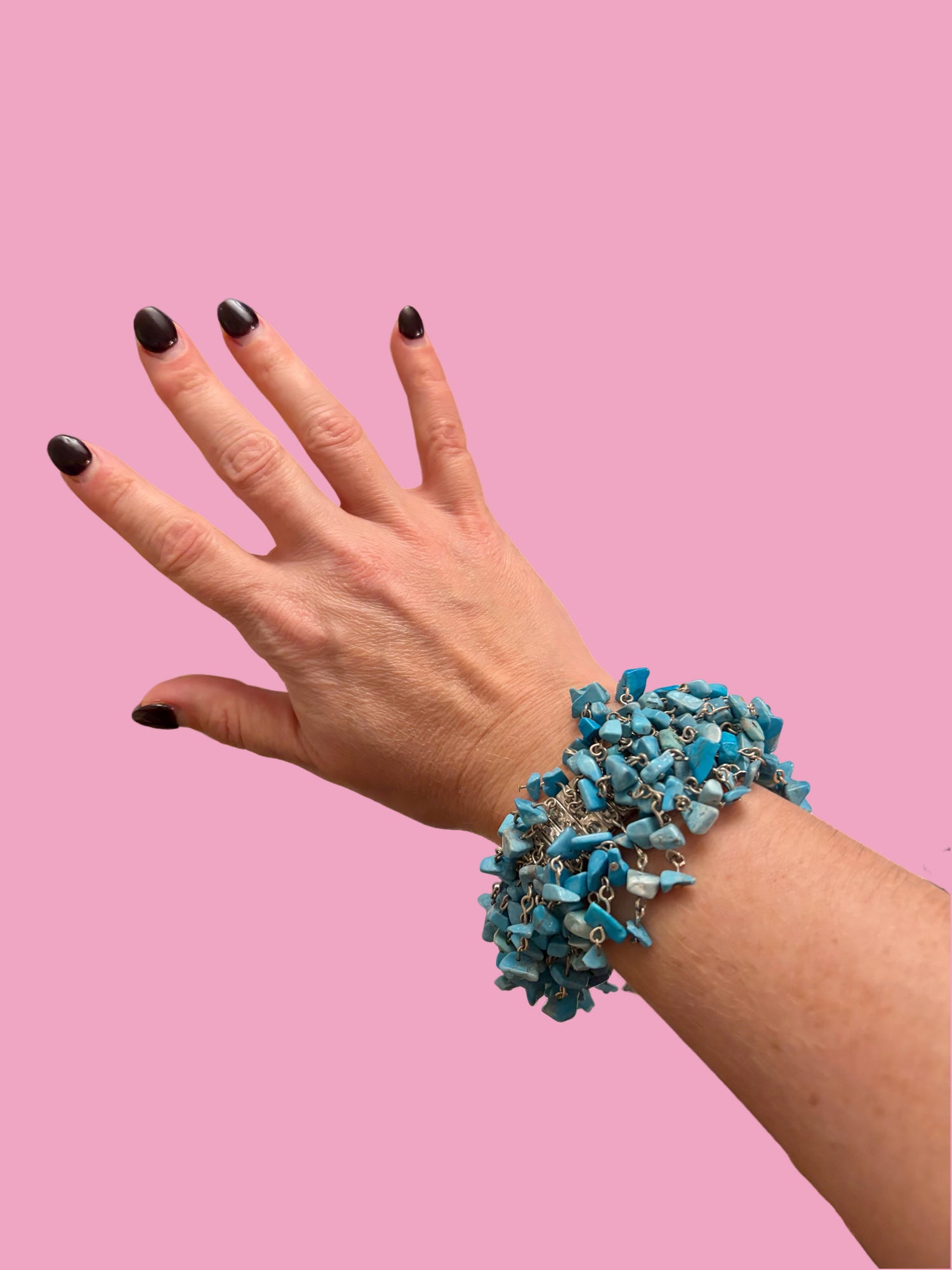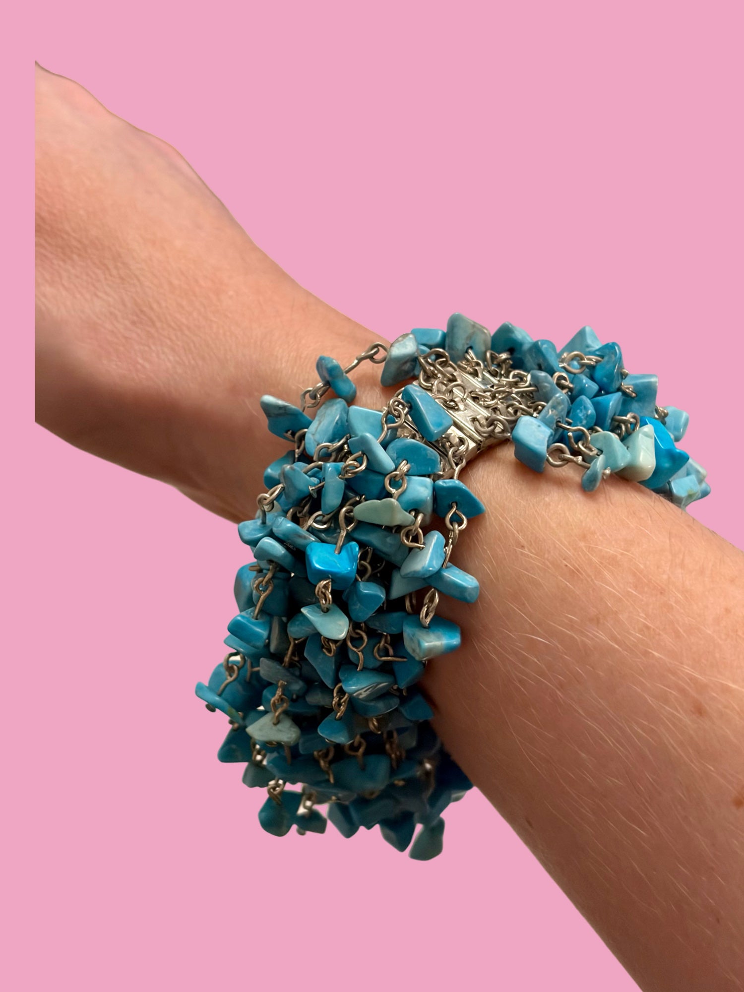 Available now! 1950s, turquoise chip piece bracelet with silver tone stretch band. She makes the best sound when you shake her! Perfect condition. Can stretch to any size wrist. This bracelet is heavy & of a high quality. $105 shipped.