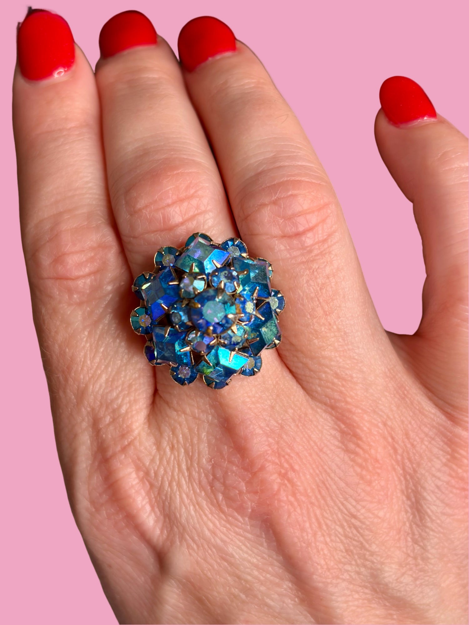 1960s Cluster Blue Rhinestone Cocktail Ring