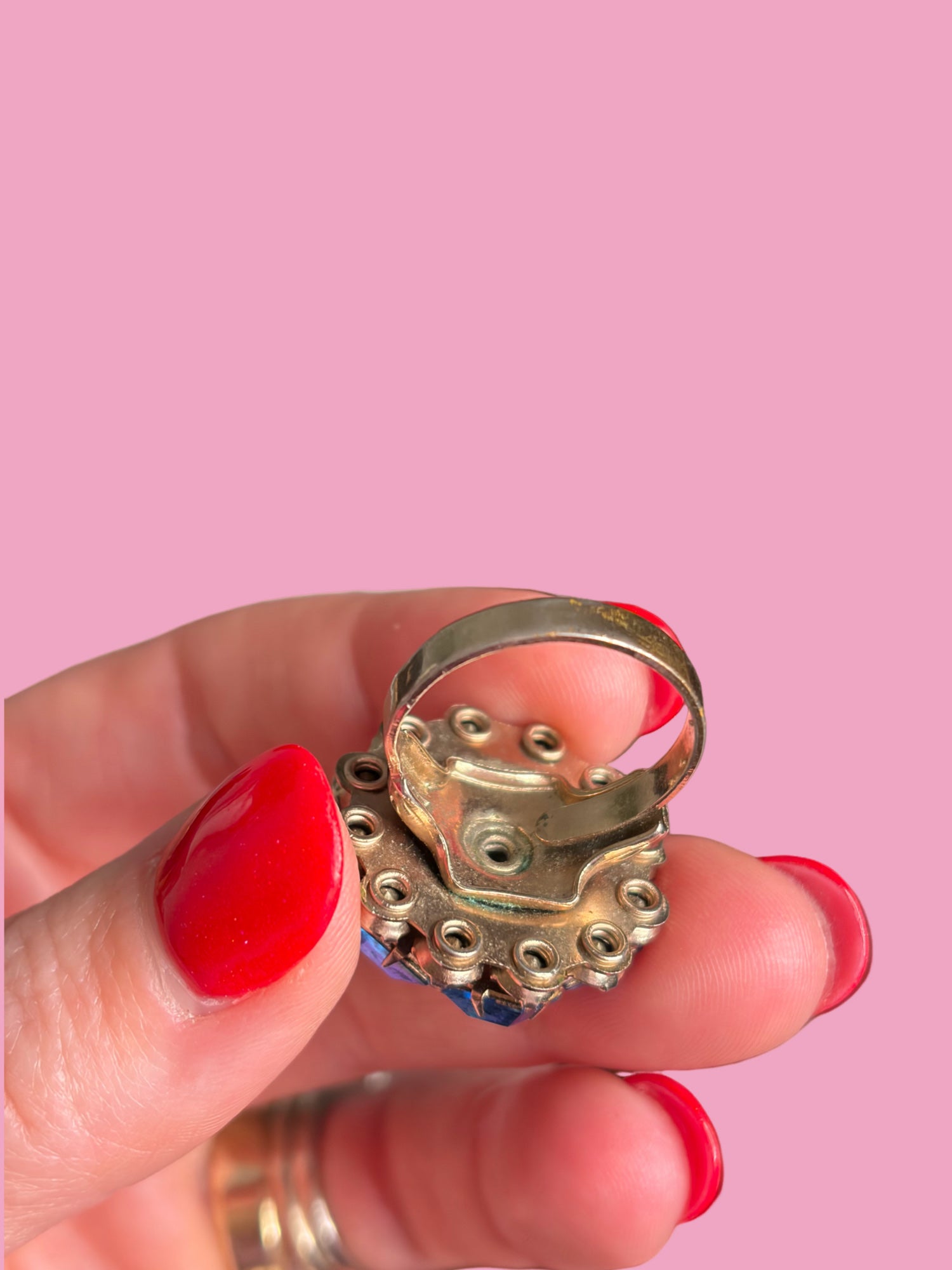 Available now! 1960s, costume, blue rhinestone, cocktail ring. She’s big & she’s beautiful! Adjustable so she can fit any size finger. Excellent vintage condition. $52 shipped.