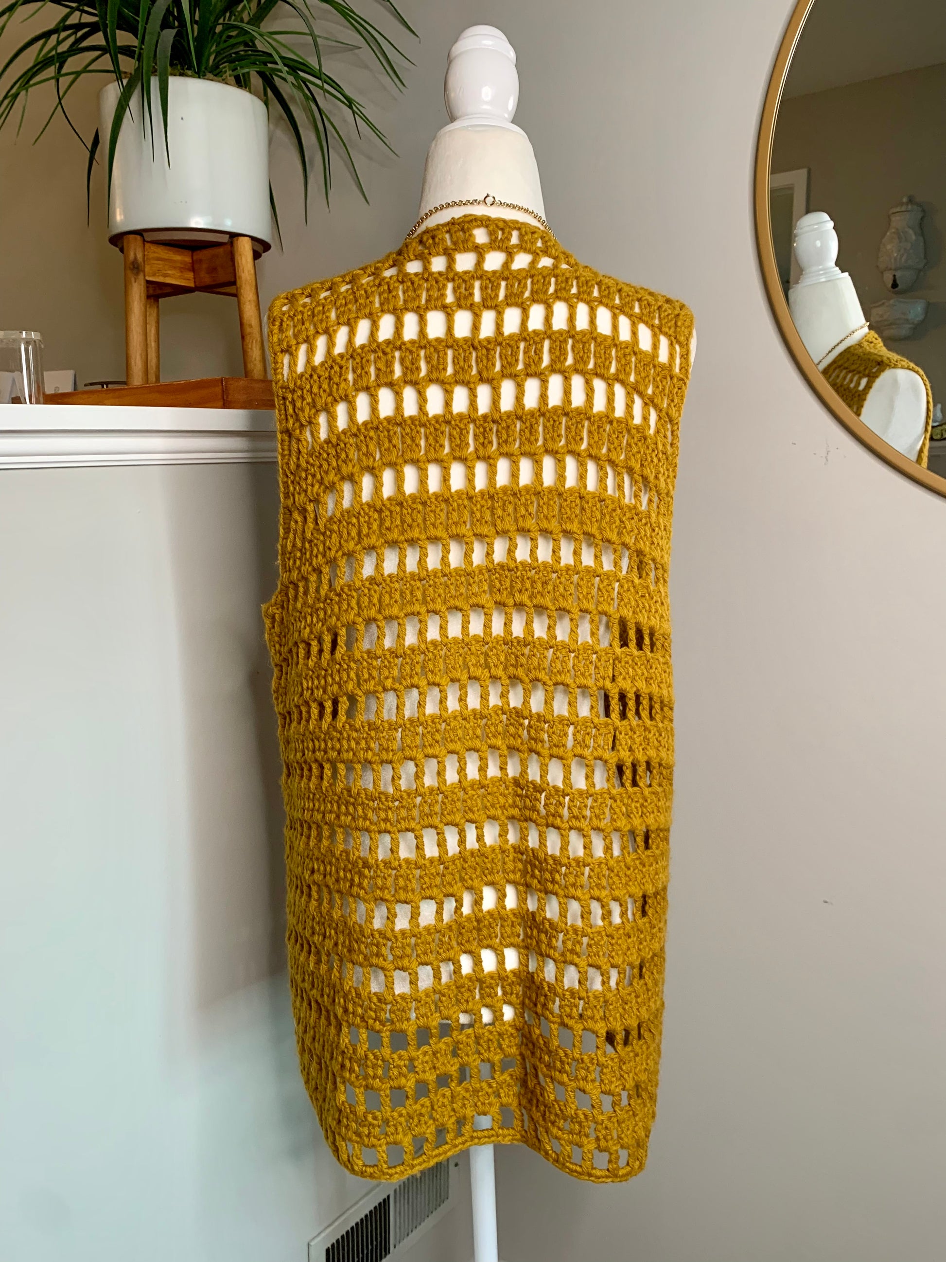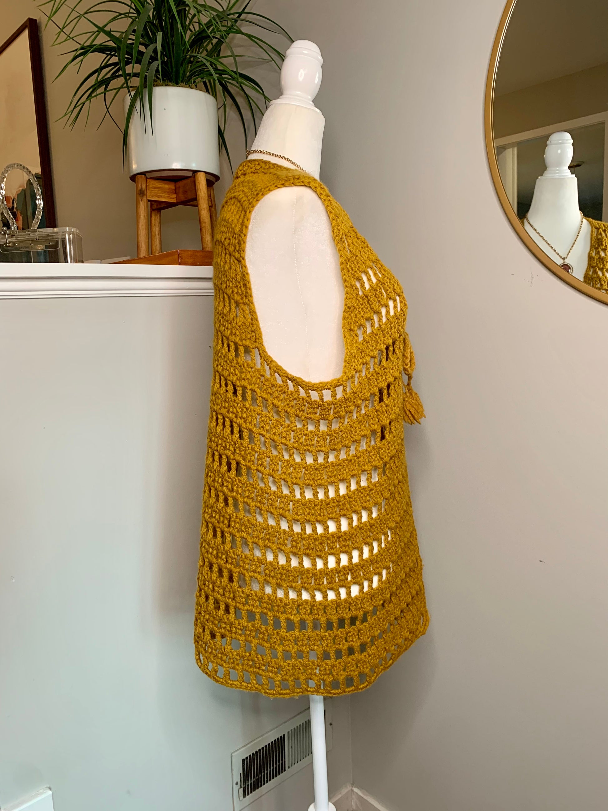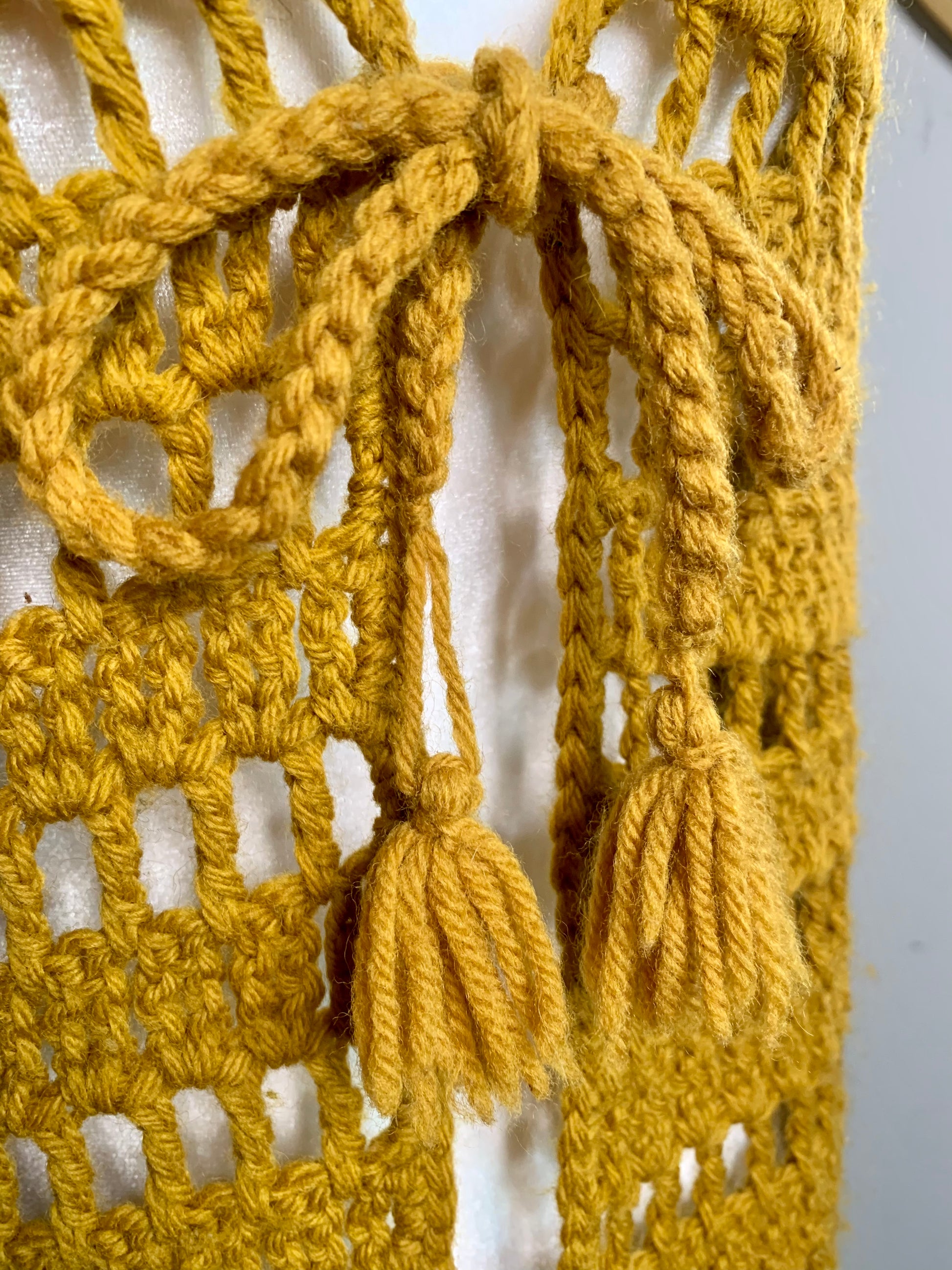 Available now! 1970s, yellow, , crochet vest with front tie (removable). Tie can be removed or placed anywhere on the vest. Mint condition! The only flaw is an uneven texture of the tie (pictured). No label. One size fits most as it has stretch to it and can be worn open. $62 shipped.