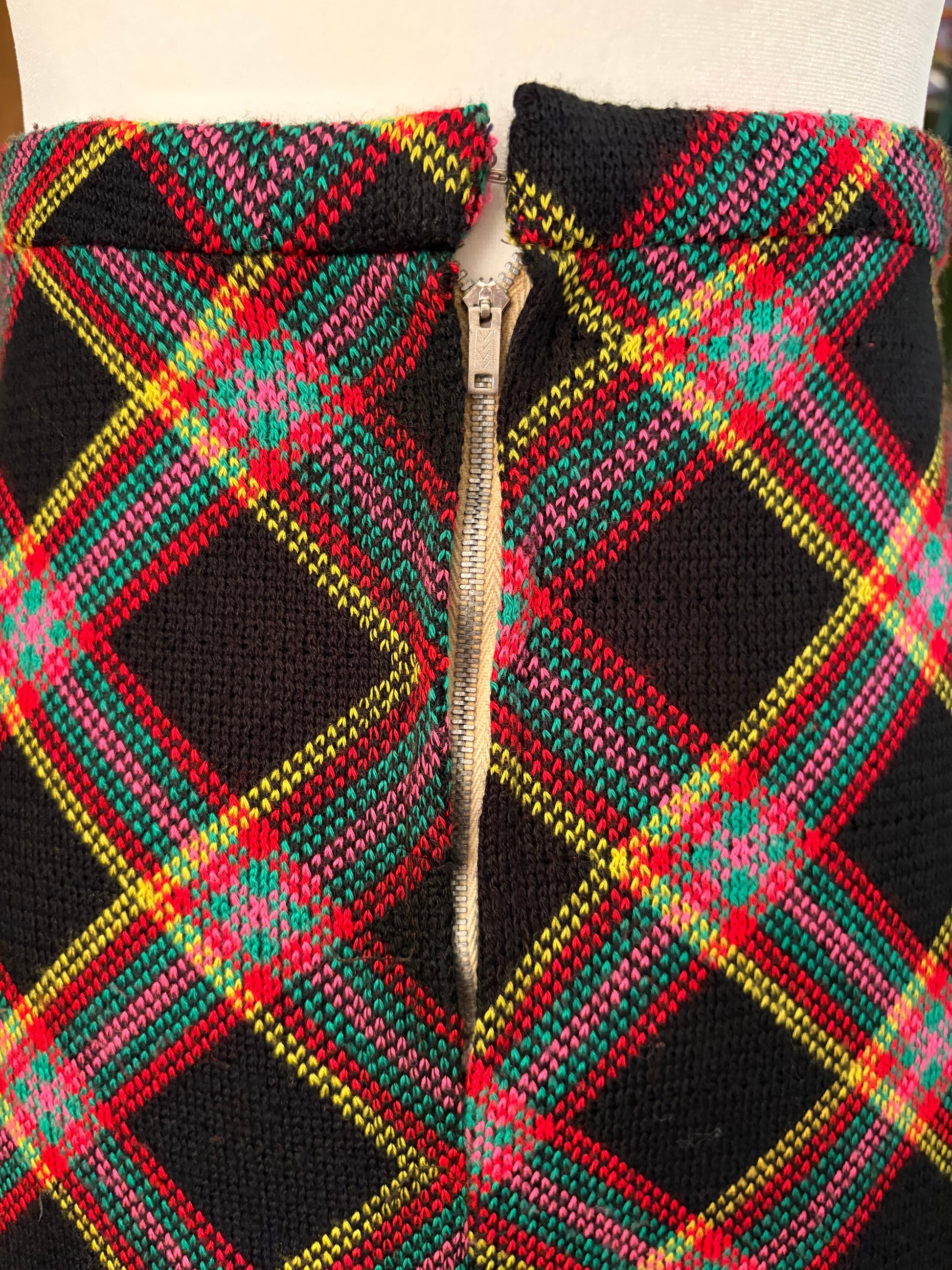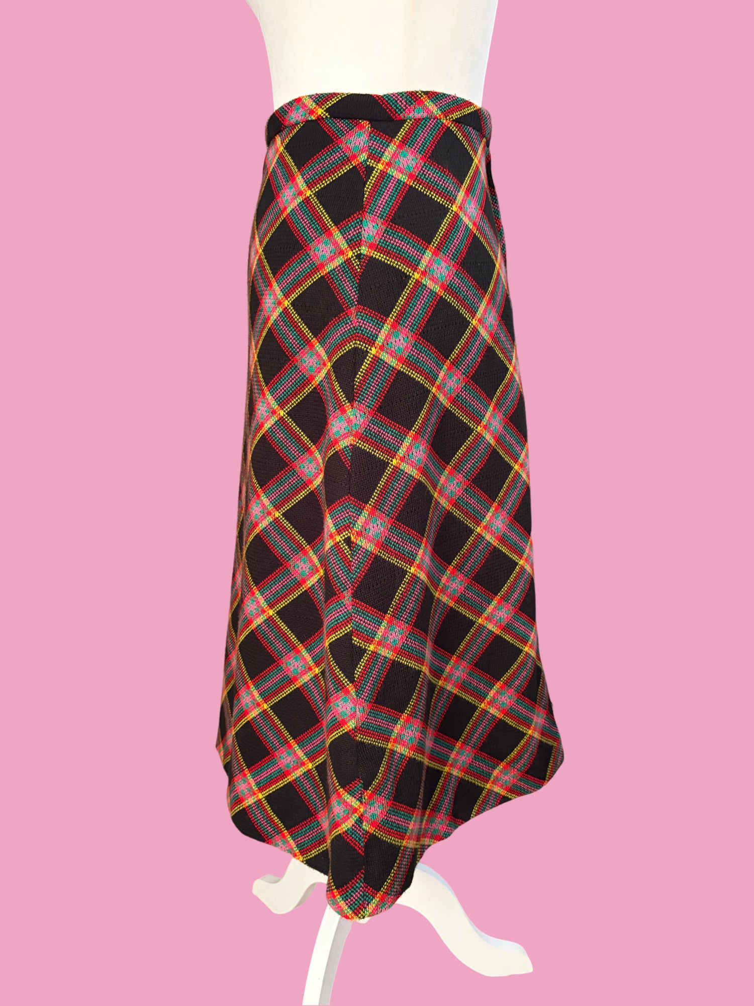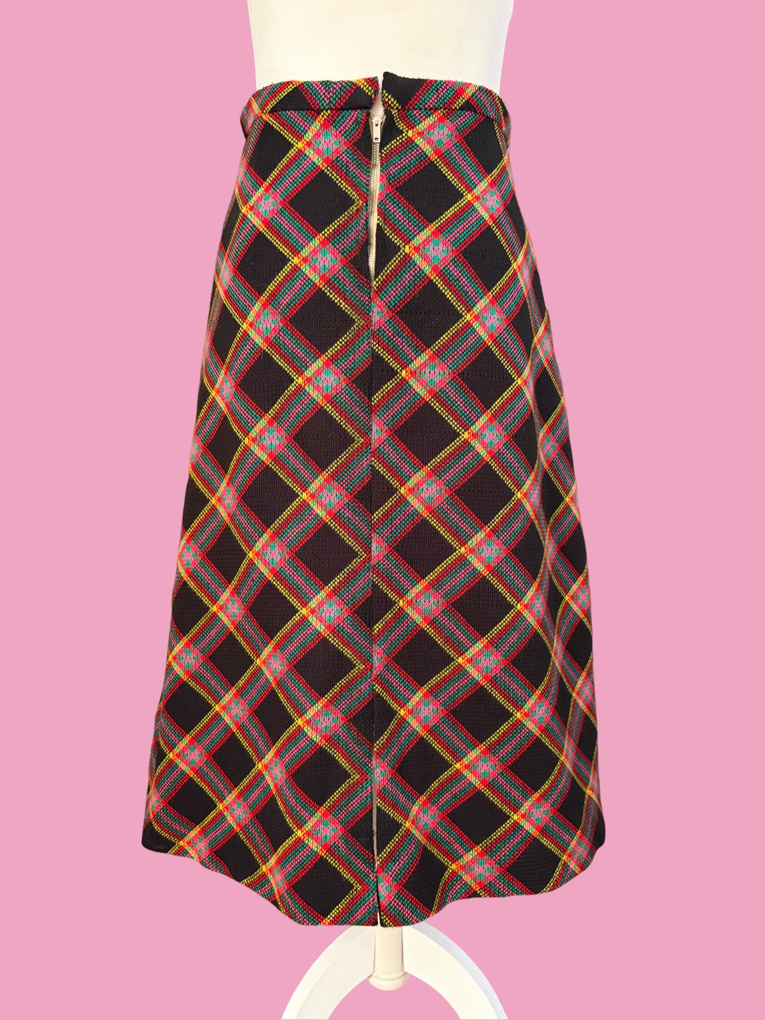 Available now! 1970s, tweed, plaid, high waisted, A line skirt in the most unique color combo! Zips up the back and secures with a hook & eye closure at the waist. No tags but made very well. Fully lined in black. I am 5’5” tall & it hits me at mid calf. Fits a size small. $89 shipped.