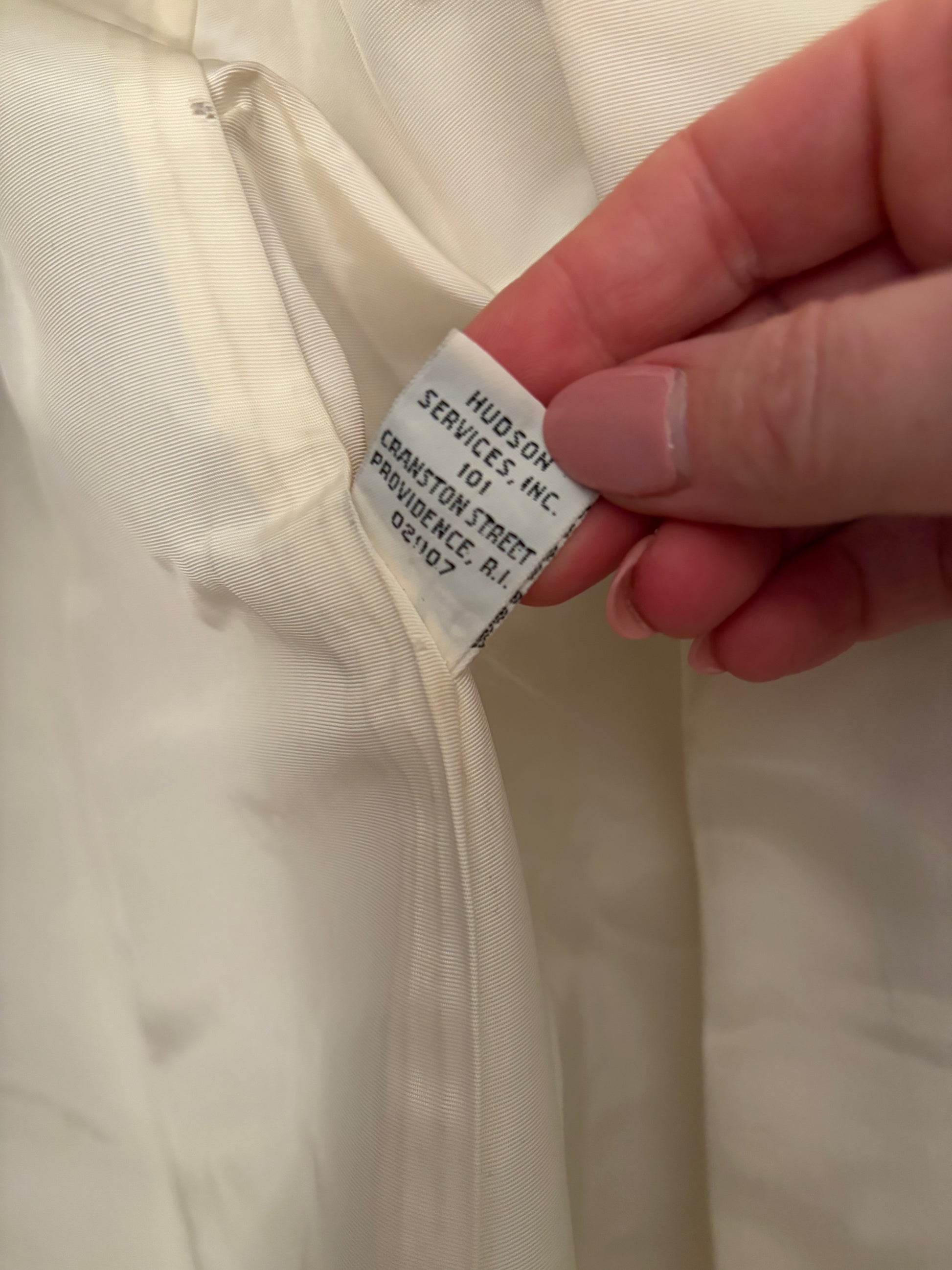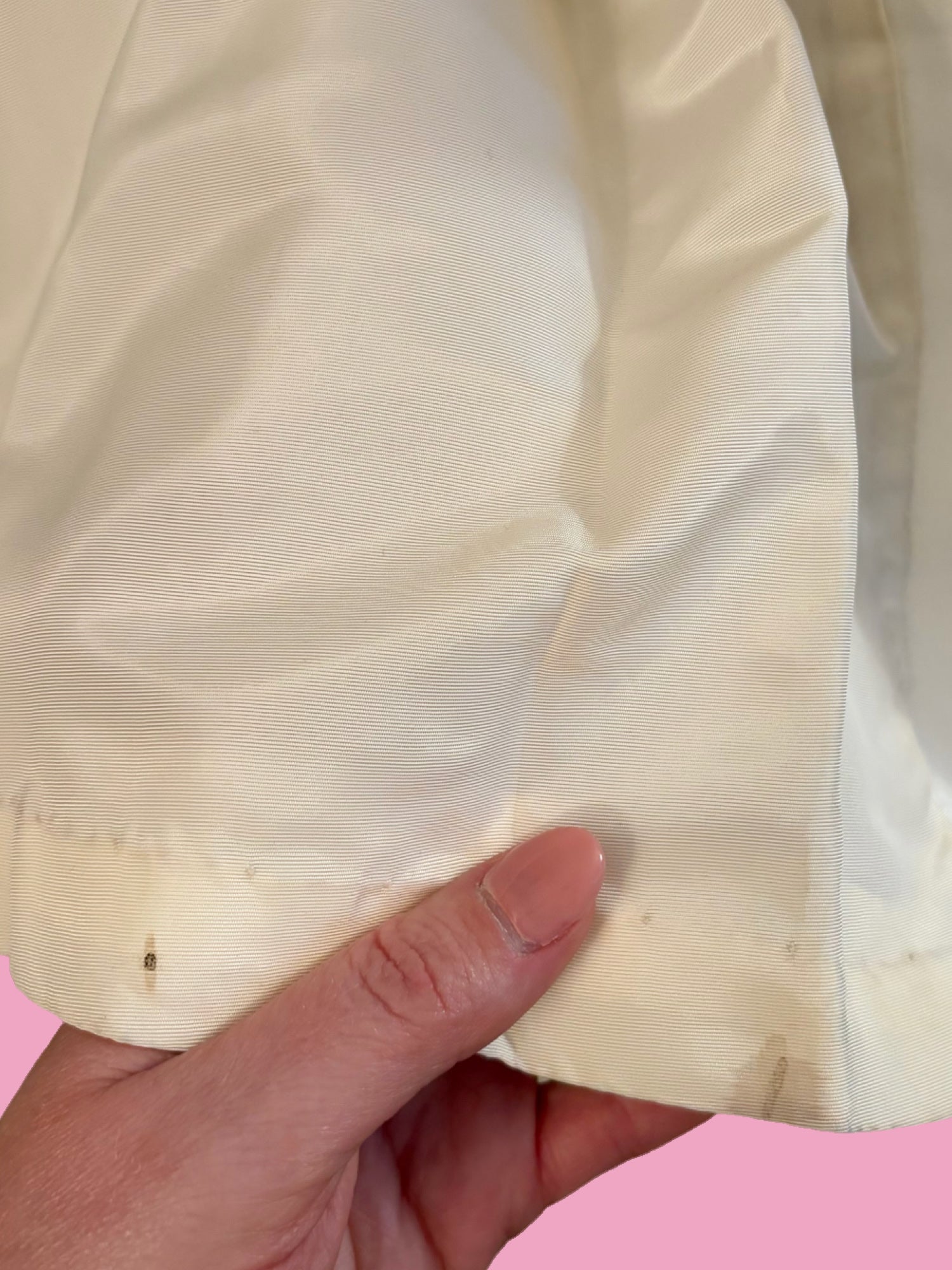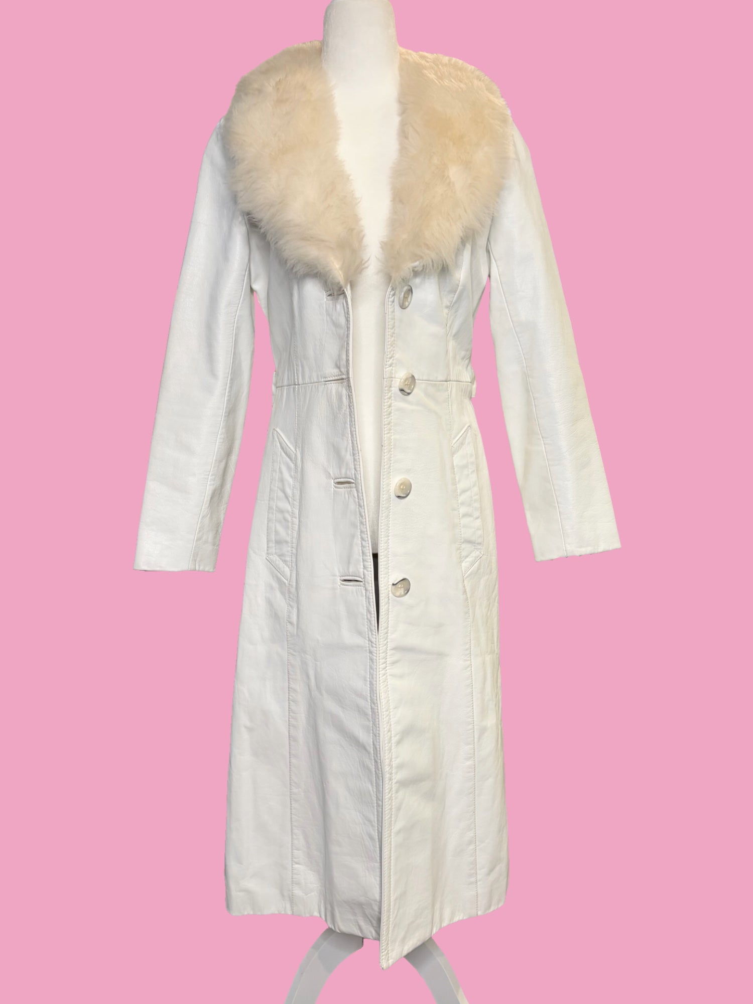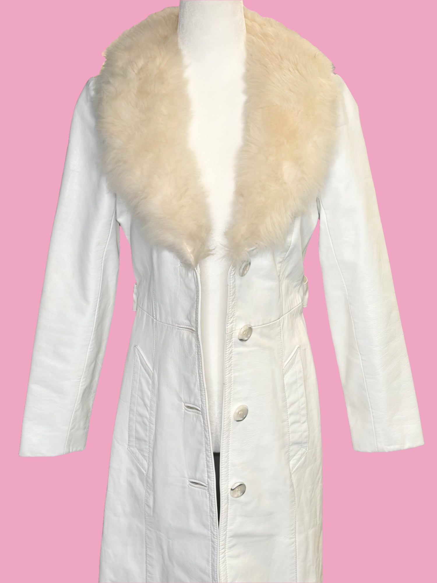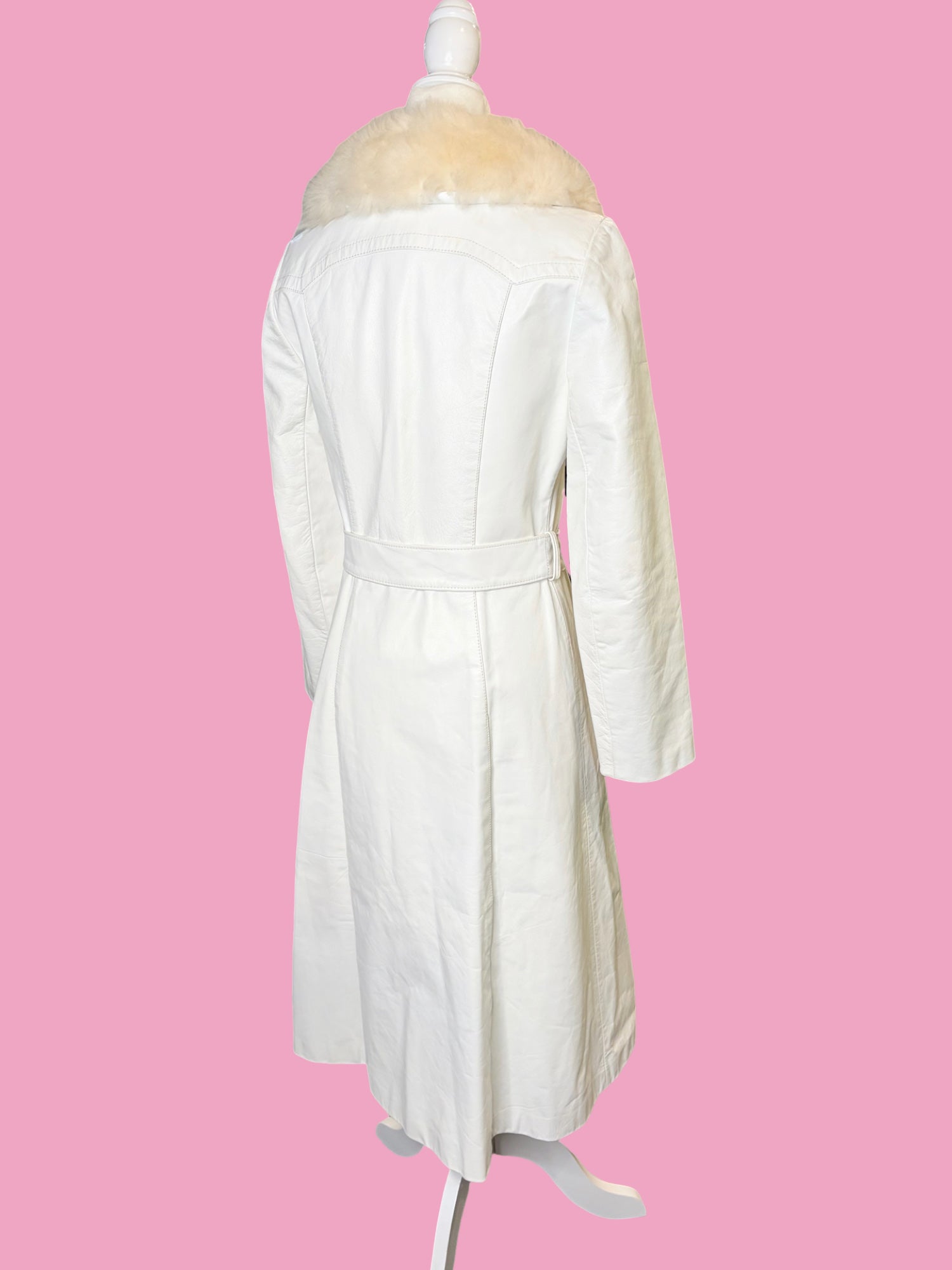 Boy, do I have a treat for y’all! This insanely cool, 1970s, white, leather, belted trench is available now! Soft faux fur in a cream color at the collar. Buttons up the front. Lined in a cream acetate. Functioning pockets on each side. There are a few stains (photographed), but not bad for a white coat after all of these years. Overall, excellent vintage condition! Fits a size XS. $285 shipped.