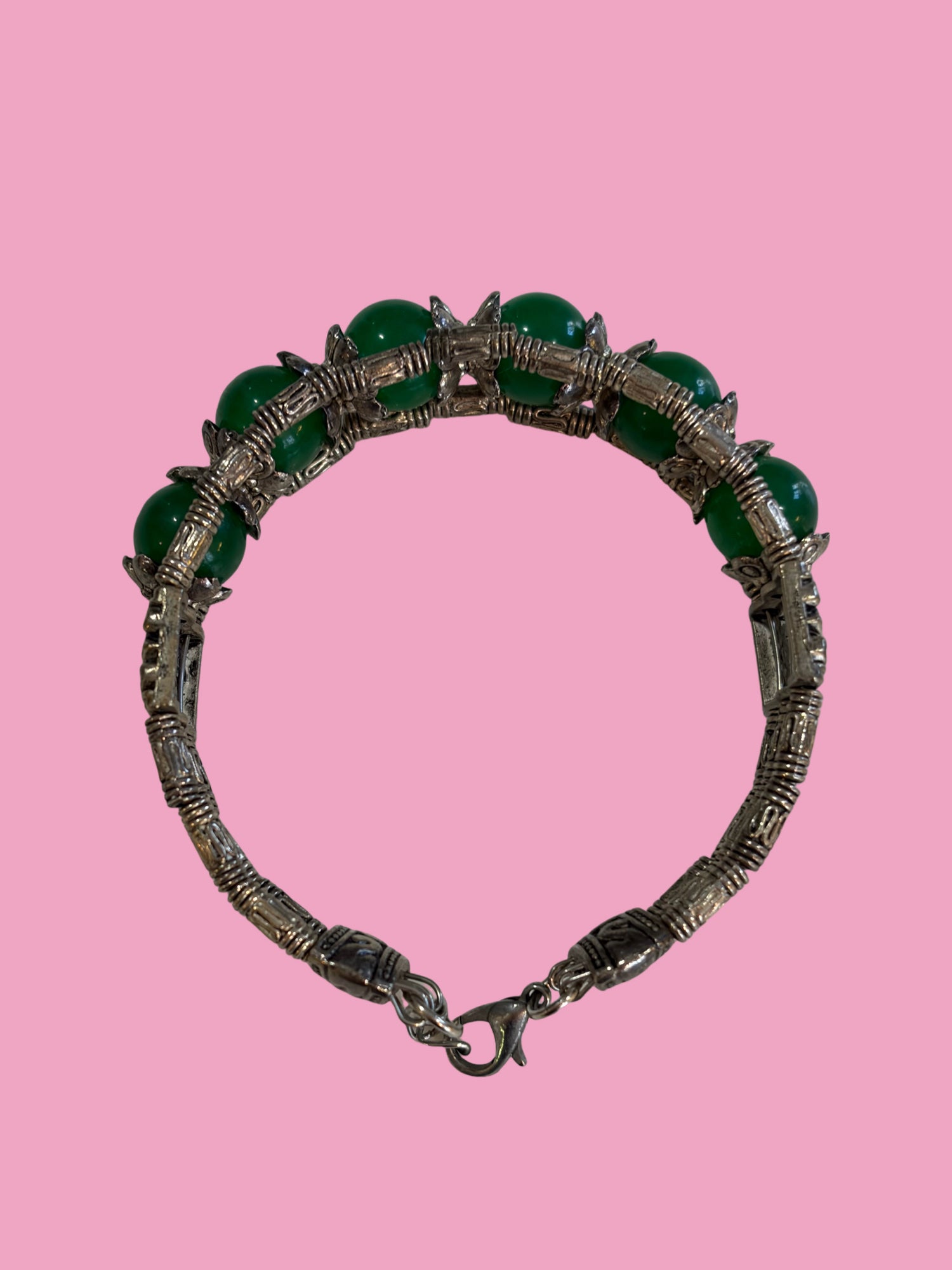 Available now! Vintage, bohemian, green bead & silver bracelet with lobster claw clasp. Several links allow for adjustable length to accommodate different wrist sizes. Costume jewelry. Mint condition! $58 shipped.