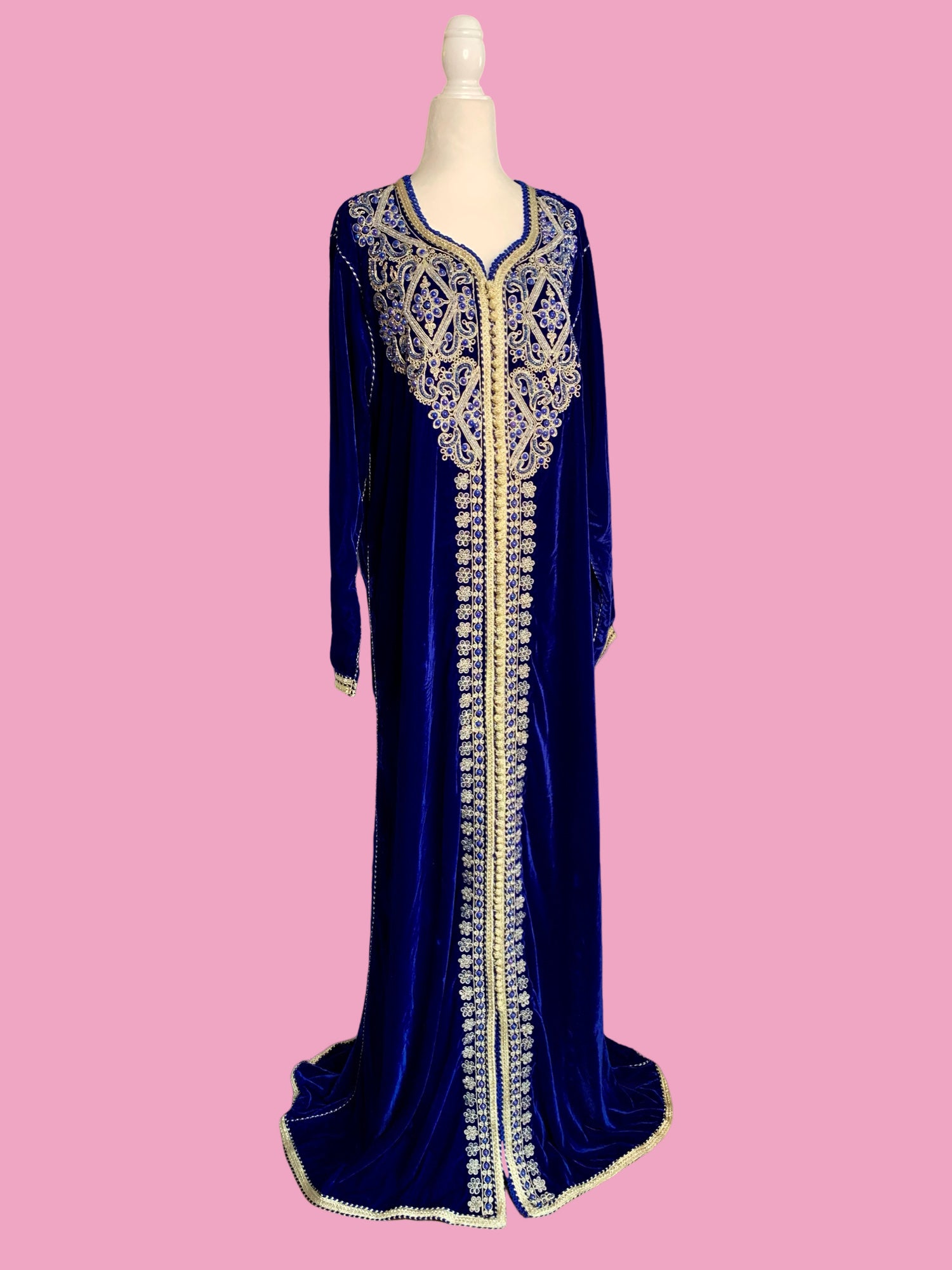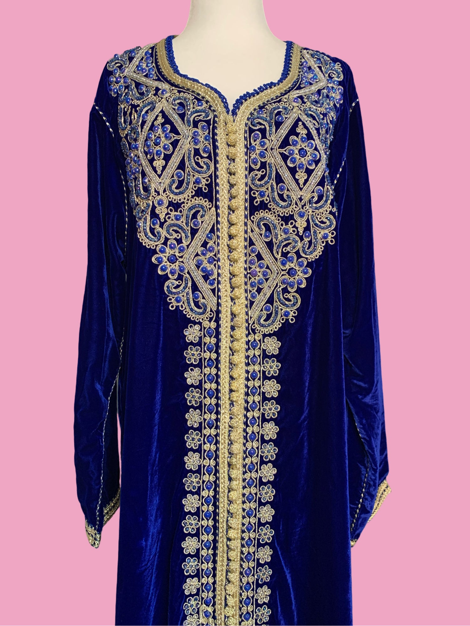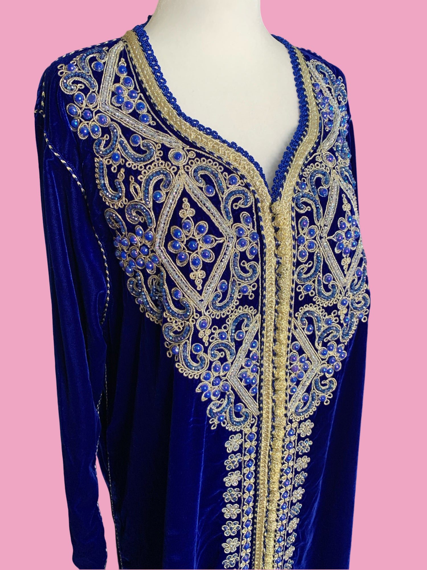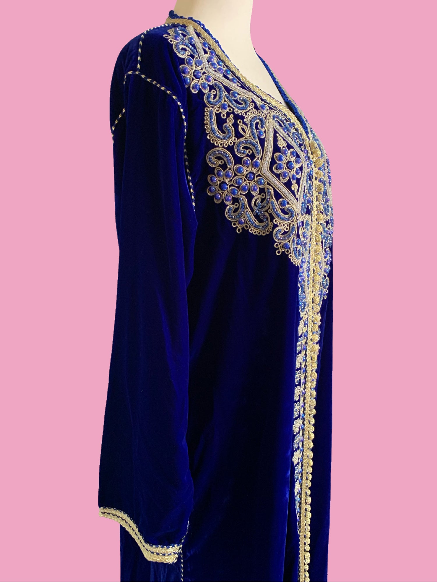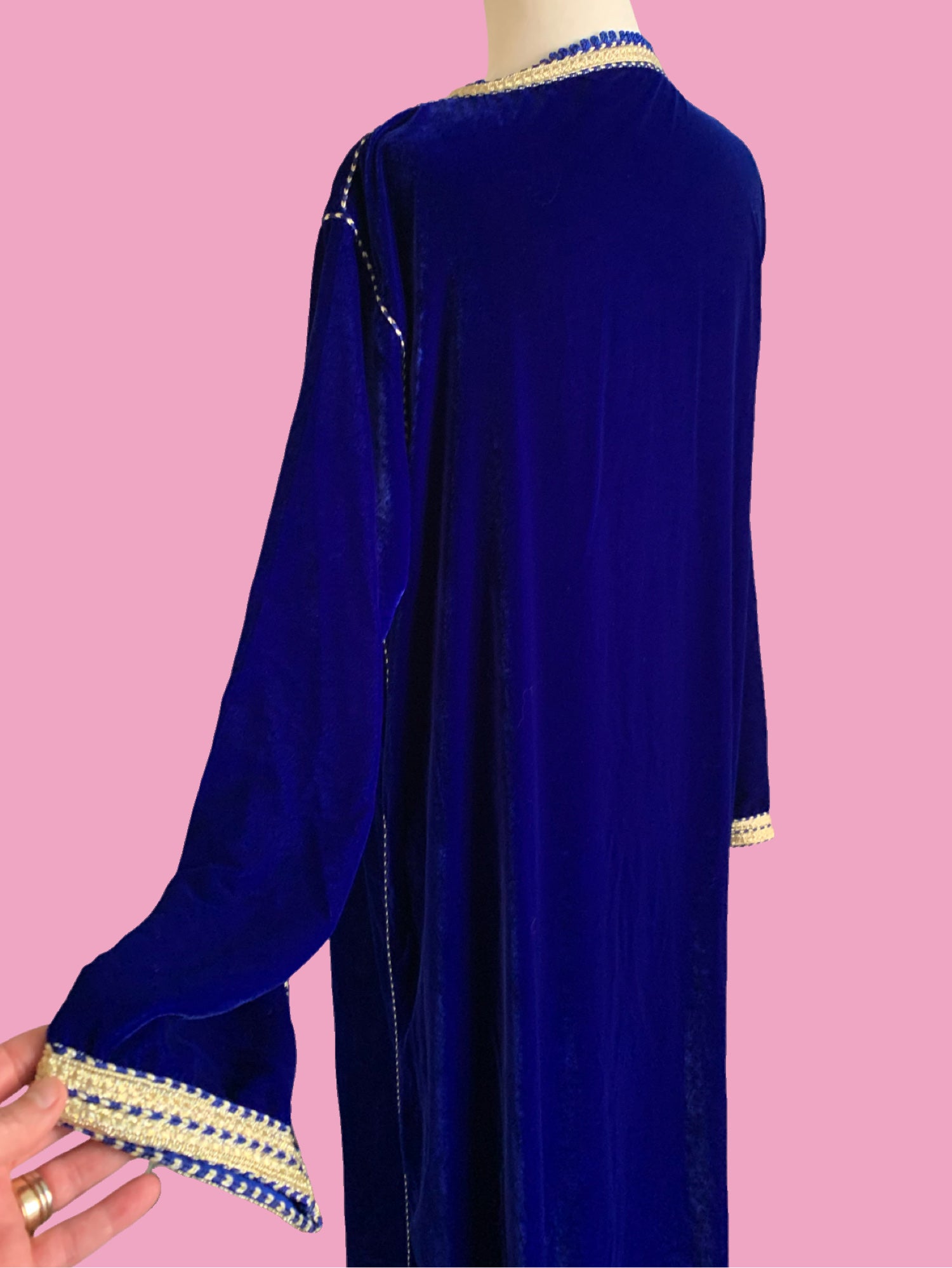 I’ve been drawn to vintage, ethnic pieces lately & this stunner takes the 🎂. Blue velvet, 1960s, Indian caftan/dress adorned with gold thread embroidery & beads is available now! No tag. Slips on over the head. High quality is evident from the weight. I can’t find a single thing wrong with her. Can fit up to a size XL comfortably. Unlined. $85 shipped.