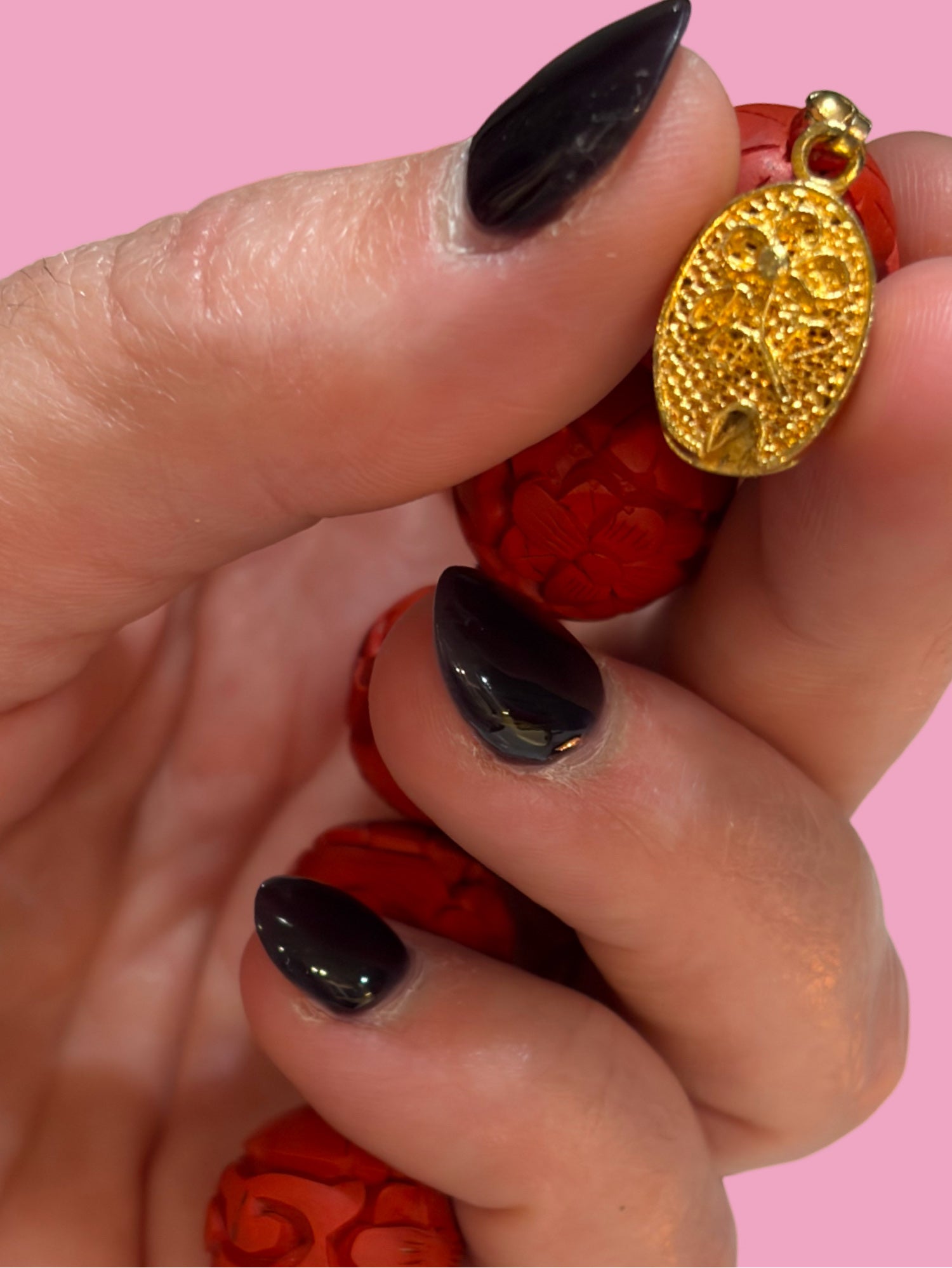 Vintage, cinnabar, carved bead bracelet w/ gold tone filigree box clasp available now! Beads are carved with a floral motif. Carved beads are separated by smaller red beads. Each carved bead measures .5”. Total length of bracelet is 8”. Excellent vintage condition! $58 shipped.